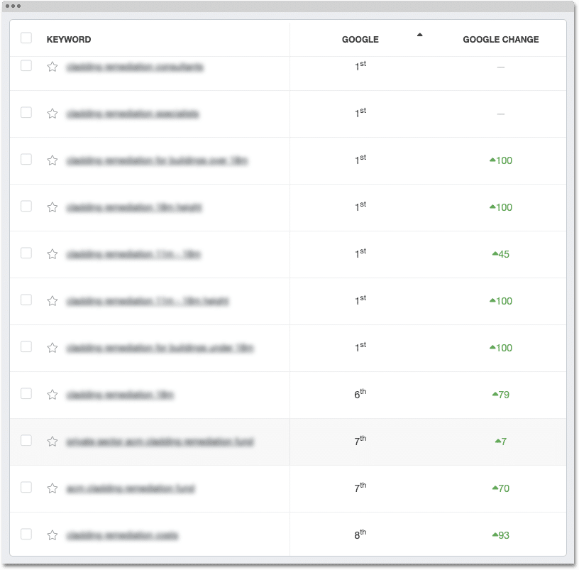 Our content creation efforts, combined with our backlink strategy, were the key to boosting up keyword positions for the search terms that mattered most to Cladding Consulting.